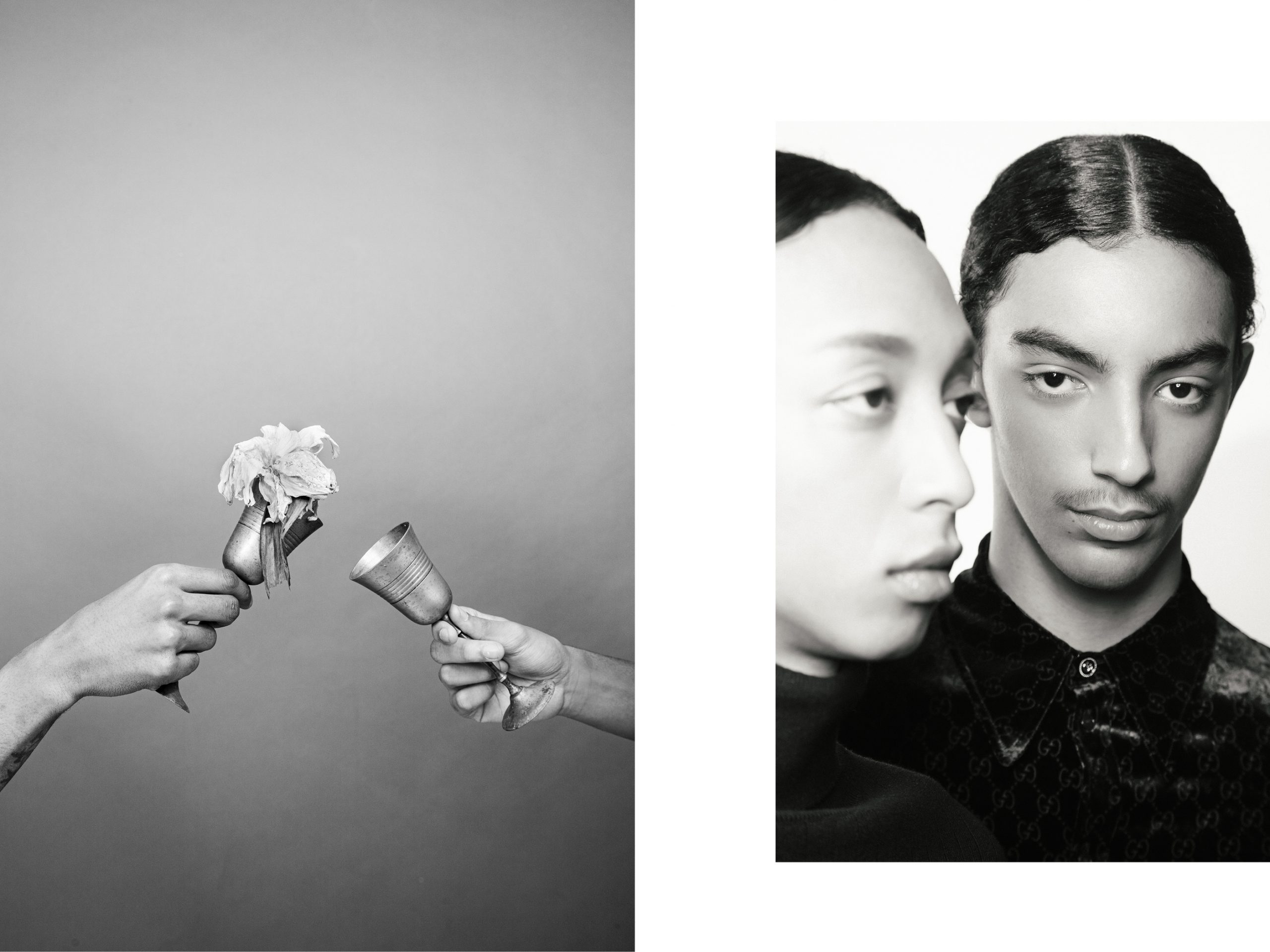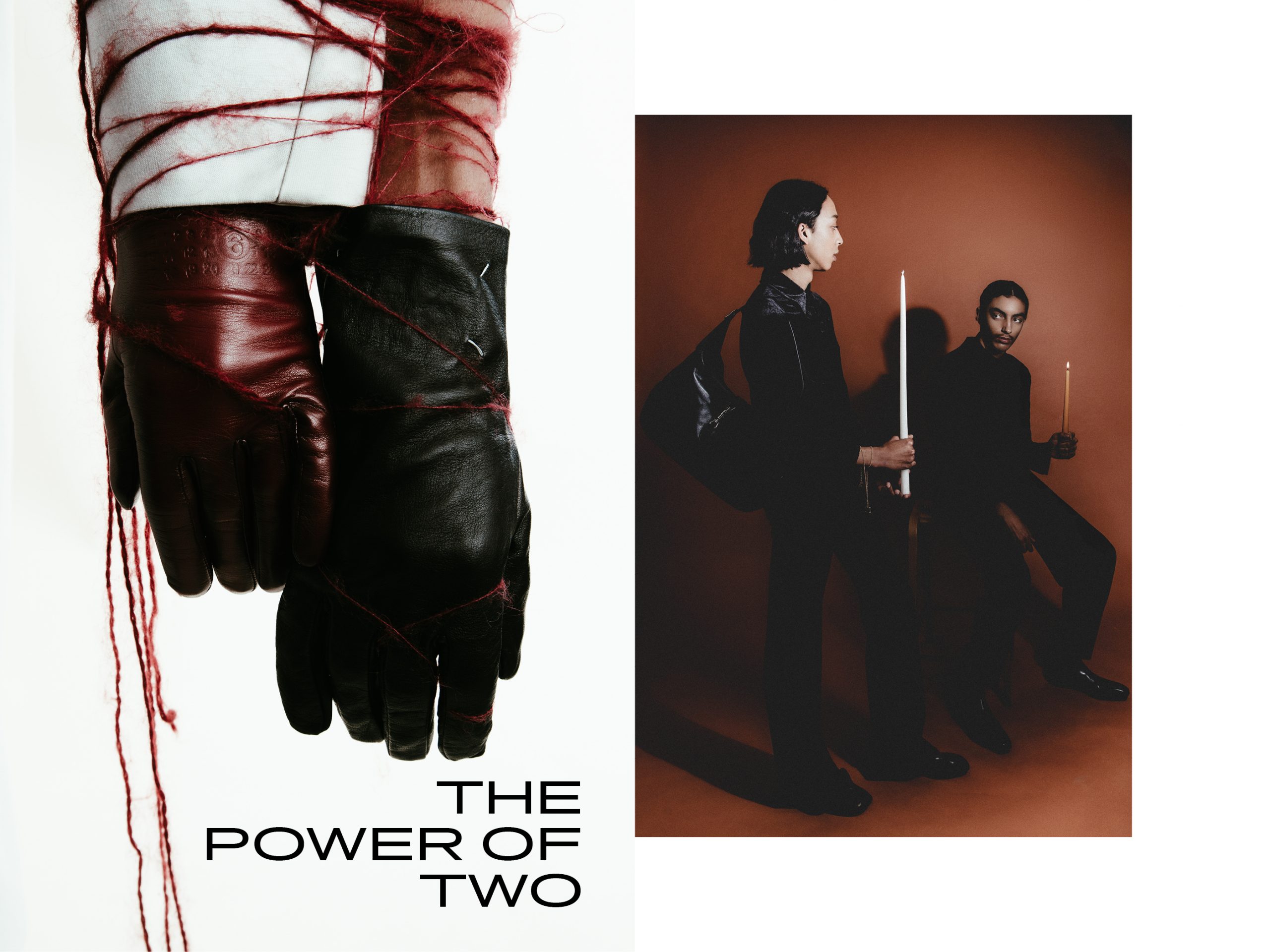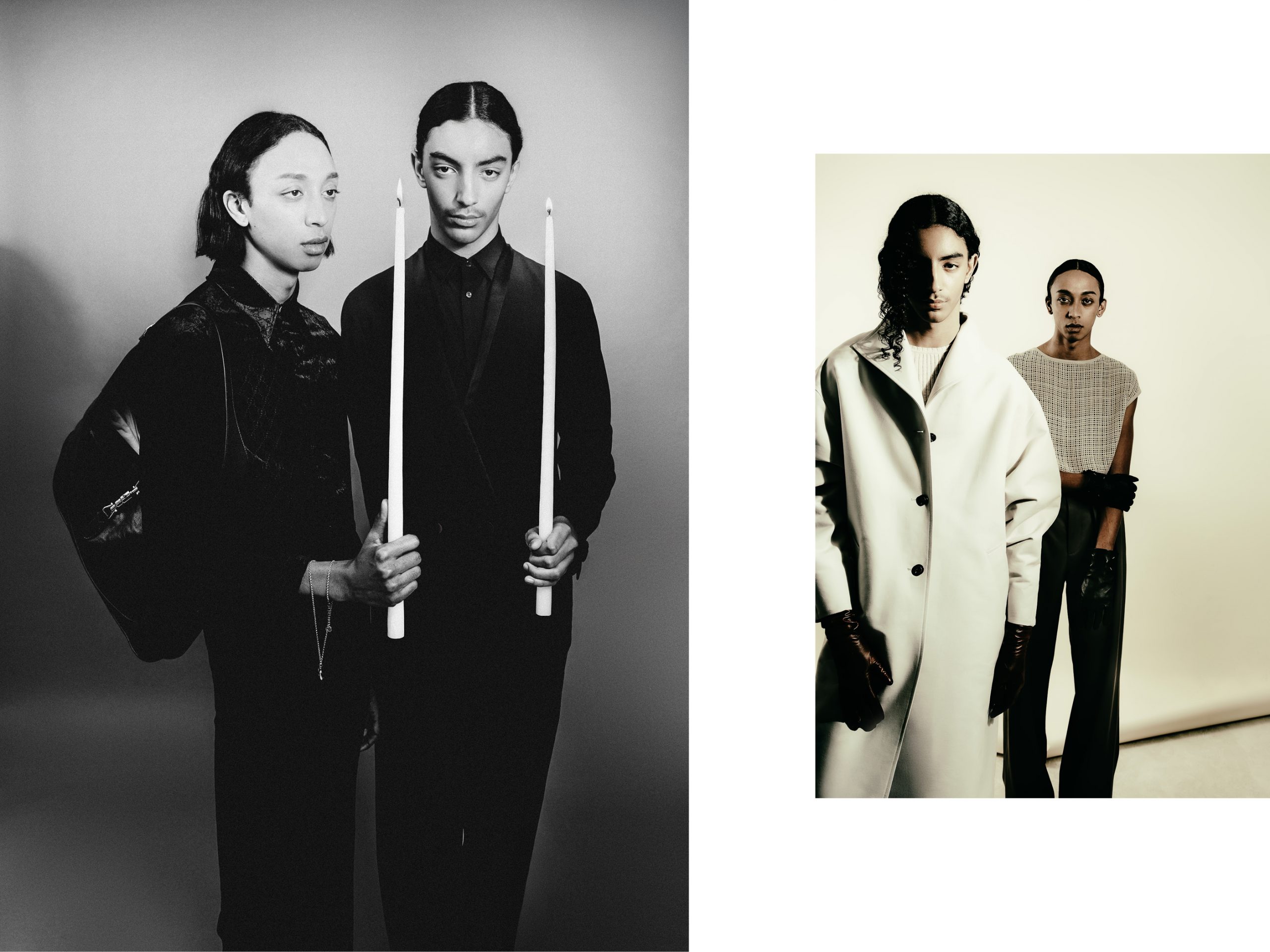 Malo (left) wears Coat SOEUR / Knit RIZ POLI / Pants SOEUR / Gloves MAISON MARGIELA / Shoes JOHN LOBBFaby (right) wears Full look HERMÈS