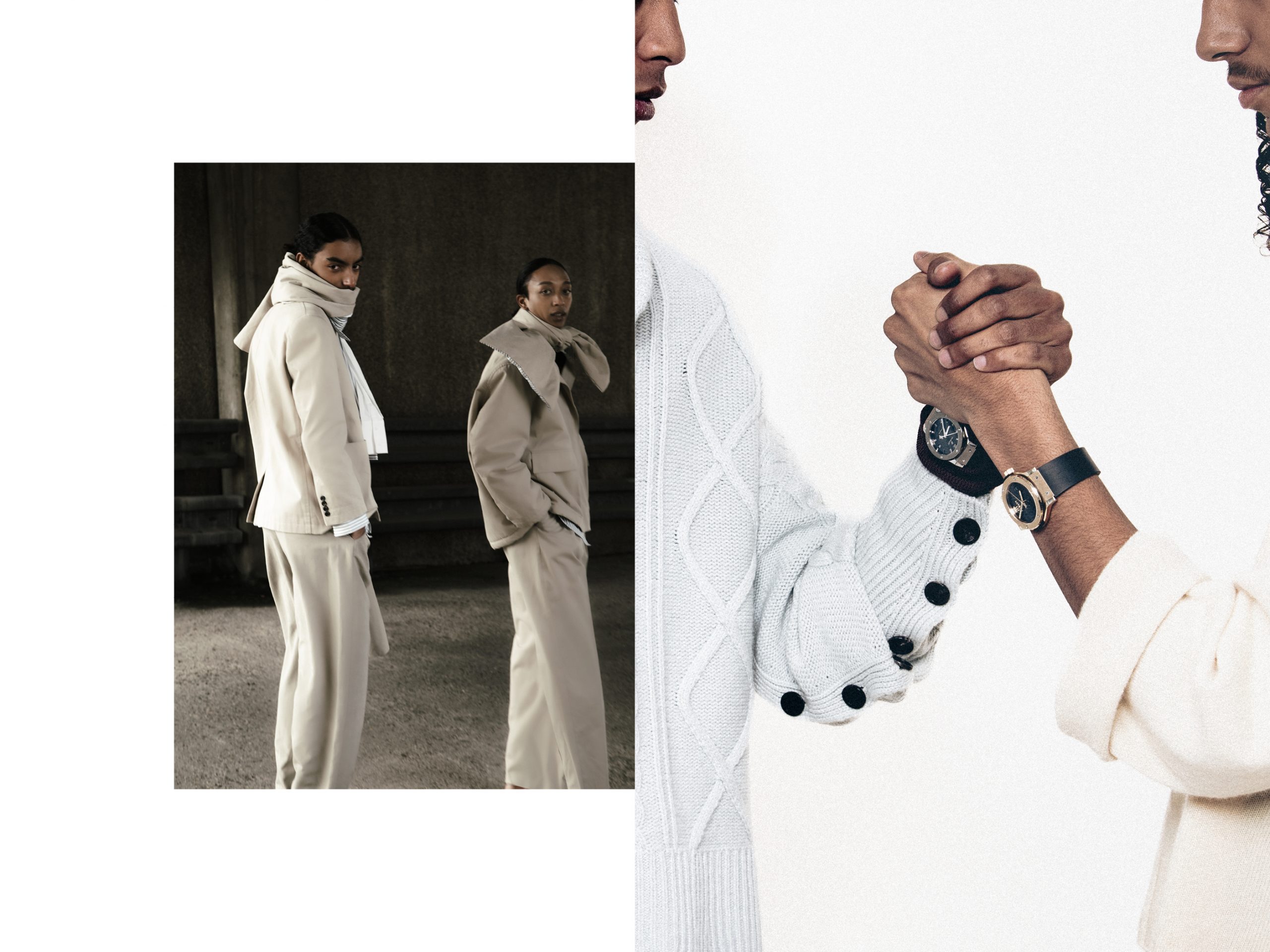 Faby and Malo wear Full look Riz PoliBoth models wear BOMPARD knits HUBLOT watches